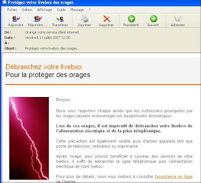 Concernant Orange, ma première réaction a été de déclencher mon anti-spam pour détruire ce mail. Pour justifier ma réaction, je dois vous dire que la dernière personne qui m’a conseillé de débrancher mes appareils electriques était ma tendre et regrettée grand-mère. J’ai pensé qu’elle revenait communiquer vers moi par le web de l’au-delà avec une bonne vieille technique de phishing (usurpation d’identité sur internet, voir la définition) . Pas du tout, mon cher vieux fournisseur d’accès prenait soin de ma fragile installation ! Voilà donc une attention assez surprenante mais plutôt bienvenue.