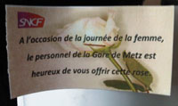 En arrivant à la gare de Metz, nous sommes accueillis sur le quai par un employé de la SNCF tout sourire (pardon si j’ai masqué son visage mais si j’ai pris sa photo, je n’ai pas son consentement formel) qui remet aux trois femmes qui m’accompagnent une superbe rose présentée dans un bel étui accompagné d’un joli mot, à l’occasion de la Journée de la femme.