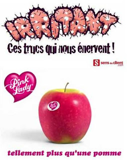 Parmi les nouveaux entrants dans ce panthéon des slogans, mon préféré est celui des pommes Pink Lady. Alors que notre société de grande consommation nous apporte désormais des produits naturels, non manufacturés tels que des fruits ou des légumes, avec une marque, la marque de pommes Pink lady s’affiche dans les grands médias avec un slogan iréel : « Pink lady, tellement plus qu’une pomme » (en illustration de ce billet) qui me laisse sans voix.