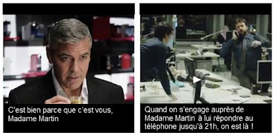 Tout d’abord EDF qui a communiqué sur ses 8 engagements client (EDF et MOI « pour une relation personnalisée ») dans une campagne déclinée de façon assez brillante sur plusieurs médias. Notons ici cette initiative que je trouve plutôt heureuse ; rares sont les sociétés de service qui simplifient leurs engagements à ce point et les rendent publiques. Dans le spot de publicité destiné à la télévision, on voit deux employés d’EDF qui déclinent leurs engagements dans leur vie privée puis concluent sur l’engagement de répondre au téléphone très tardivement à leur cliente. « Quand on s’engage auprès de Madame Martin à lui répondre au téléphone jusqu’à 21 heures, on est là ! », déclare un des deux personnages.