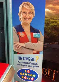 Dans cette catégorie, je voulais signaler la très bonne initiative de La Grande Récré, qui, non contente de relayer avec application son gilet aux couleurs de l’enseigne, a ajouté une touche qui lui donne un caractère unique. Cet accessoire original est un badge que l’employé porte pour se qualifier : papa conseil, mamie conseil, grand frère conseil, … C’est une très bonne illustration de la créativité possible sur une tenue d’employé.