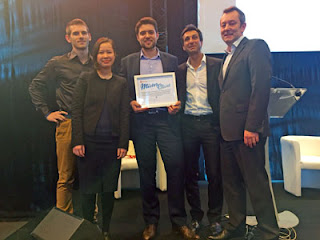 La remise du prix a eu lieu sur le Salon Stratégie Clients en présence de Philippe Dias, Responsable marketing digital et innovation de Natixis et Emmanuel Amouretti, Directeur Général de Cantoche / Living Actor (le concepteur de l’agent). Ils sont tous les deux en photo avec deux étudiants du Master Marketing Opérationnel International de l’Université Paris X sur scène.
