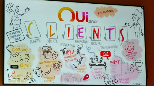 - Les conseillers facilitateurs. Un travail a été fait avec les conseillers pour améliorer la posture et créer une signature relationelle. Eviter le jargon, parler client, se faire comprendre par les clients, prendre en charge la création de dossier là où ils étaient auparavant invités à le réaliser par eux-mêmes. OUI.sncf souhaite que les équipes en contact se demandent à la fin d’une conversation, non pas « est-ce que j’ai suivi les process ? » mais bien : « est-ce que j’ai été utile, est-ce que j’ai rendu service ? ». Les trois attitudes choisies sont : Enthousiaste, Solution Makers (fournisseur de solution) et Proactifs.